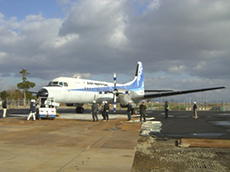 午後3時前、東京行き984便の出発を合図に作業スタッフがYS-11の周りに集まります。