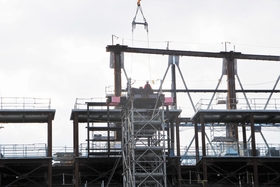 上棟式には、工事関係者約50名が出席し、アリーナの屋根を支える1本目の梁(はり)の設置を記念し、建物が無事に完成することと、完成後のSAGAアリーナの末永い繁栄を祈願して行われました。