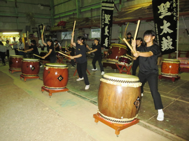 はじめに、会員の皆さんから活動概要等についてお伺いし、実際に和太鼓を披露していただきました。式典のオープニングで演奏することが多いという「あがり屋台」など3曲をお聞かせいただきました。全身を使った迫力ある演奏は感動的で、日々熱心に練習に励まれている様子がうかがえました。