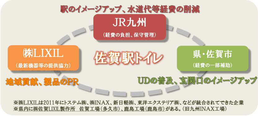 JR佐賀駅のUD化改修工事が始まります 最終更新日:2015年10月22日 佐賀県では、年齢、性別、障害のあるなしや国籍等の違いに関わらず、誰もが安心して暮らすことができる社会の実現に向け、「人を想い、共に生きる、ユニバーサルデザイン社会の実現 ~HITO(ひと)プロジェクト~」をキャッチフレーズに、ユニバーサルデザイン(UD)の取組を推進しています。 このたび、多くの方々が利用されているJR佐賀駅のトイレ(本屋西側のトイレ)を誰もが利用しやすく、快適なトイレとなるよう、またUDのシンボル的存在となるよう改修工事を行うこととなりましたのでお知らせします。 記 1 工事期間(予定) 平成27年11月4日(水曜日)~12月25日(金曜日) 2 改修の目的 誰もが利用しやすく、快適なトイレ 「見て、触れて、実感できる」UDのシンボル的な存在 県都の玄関口である佐賀駅のイメージアップ 3 改修の手法 県内に2つの工場がある(株)LIXIL様のご協力を得て、コラボ事業として実施します。 4 改修のポイント (1)ユニバーサルデザインの各種基準に適合 佐賀県福祉のまちづくり条例のユニバーサルデザイン施設基準に適合 佐賀市バリアフリー整備マニュアルに適合 (2)「子育てし大県佐賀」に向けた設備を充実 男子用・女子用とも全てのブースにベビーキープを設置 簡易多目的ブースには、男女ともベビーシート(おむつ替えベッド)及びチェンジングボード (着替え台)を設置 女子用トイレにも男児用小便器を設置 <別添資料> ○完成イメージ図