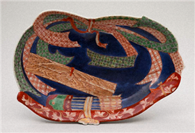 「破魔弓」とは、男子の初正月の祝いとして飾られた魔よけの弓矢のこと。本作は破魔弓や熨斗、文箱などの祝いにまつわる品々が皿を象り、拡張高く祝祭的な雰囲気に満ちています。1712年に弱冠4歳で七代将軍に就任した徳川家綱に贈られたという説もある有田色絵磁器の名品です。 |
