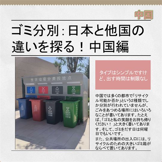 この国はゴミ分別をしていますか? 最終更新日:2025年8月27日 この記事はインスタグラム(外部リンク)にも載せています。 リュウ・ソウナン(中国出身)この国はゴミ分別をしていますか?中国編です。中国では多くの都市で「リサイクル可能か否か」という2種類でしか分別が行われていませんが、ごみをあつめる場所にはいろいろなことが書いてあります。たとえば、「ゴミと私の笑顔をお持ち帰りください! 」と大きく書いてあります。そして、ゴミをだす日は何曜日でもいいです。また、公共場所の出入口には、リサイクルのための大きいゴミ箱がならべて置いてあります。 キム・ジヒョン(韓国出身)ゴミ分別:日本と他国の違いを探る!韓国編分別方法は全国一律!ゴミ袋があって、分別の種類も日本とほぼ一緒です。分別の種類は燃えるゴミ・燃えないゴミ・生ゴミ・リサイクル(プラスチック、ビニール、紙類、瓶、カン)、粗大ゴミなどで、地域別の違いはないです。日本と同じく袋を買わないといけませんが、面白いことに、スーパーやコンビニで買い物をして有料レジ袋を買ったら、普通のビニール袋ではなく、ゴミ袋を選ぶこともできます。 ラウリ・エレナ(フィンランド出身)ゴミ分別:日本と他国の違いを探る!フィンランド編分別はするけど、出す時間は気にしない!フィンランドではとにかく細かくゴミの分別を行い、8種類くらいに分けて出します!家の外が別部屋に設置されてある各種類の容器に入れて、日付や曜日を全く気にせずにいつでも回収待ちにおける!しかし、容器がいっぱいでふたがしまらなかったら追加料金がかかります...クリスマスあたりにはプレゼントの段ボールや紙で容器が何週間もいっぱいのままという事態も... ハ・ニエン(ベトナム出身)ゴミ分別:日本と他国の違いを探る!ベトナム編ベトナムのゴミたちは大家族のようだ!ベトナムのゴミたちは、大家族のように同じ袋に一緒に入っていますが、日本のゴミたちは「僕は燃えるゴミだから。君は瓶だから」と別々の袋に入っています。しかし、最近のベトナムの企業や家庭では自主的にゴミを分別するところもあります。将来的にゴミ分別が義務化される時代に突入するかもしれませんね。