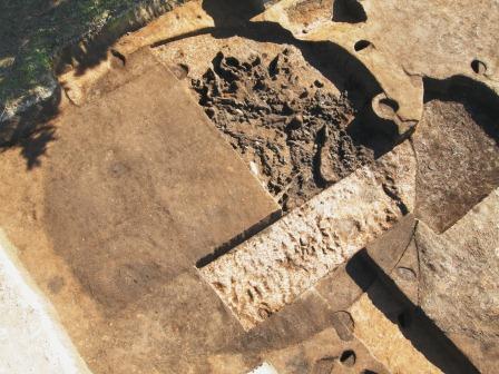 なかでも、395調査区東部で発見された竪穴建物跡(SH2203)からは、炭化した木材や、焼けた土などが大量に出土しました。このことから、何らかの原因によって火災を受けて焼けてしまった建物(焼失住居跡)の可能性が高いと考えられます。この建物跡の内部からは、弥生時代前期前半の土器が少量出土したほか、剥片石器や石斧が出土しました。