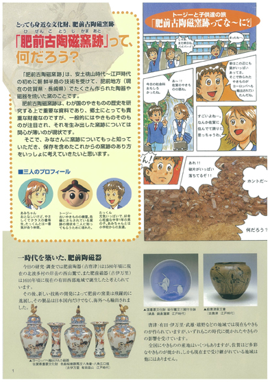 肥前古陶磁窯跡を守りたい 最終更新日:2023年4月25日 このページでは、トージー君と子どもたちが肥前古陶磁窯跡の保存について学んでいきます。 みなさんも一緒に、冒険をしながら、焼きもののことやその保存のことについて勉強しませんか。 タイトルか、小さなマンガの画面をクリックするとマンガを見ることができます。 1 トージーと子供達の旅 「肥前古陶磁窯跡ってなーに?」 2 窯跡ナビゲーター・トージー君登場 「登り窯の構造」 3 今、古陶磁窯跡に危険信号!! 「登り窯はどんな場所に作られたのでしょう?」 「後をたたない悪質な盗掘」 4 盗掘により窯跡は破壊の危機に! 5 工事の前に教育委員会へ連絡を 「乱開発による破壊」 6 日常生活の中にも潜んでいる破壊行為! 「窯跡の破壊につながる、なにげない行為」 7 みんなで大切に守っていかなくちゃ!! 「なぜ肥前古陶磁窯跡を保存する必要があるのでしょうか?」 8 自治体の活動だけではすでに限界! 「急がれる保護・保存活動―自治体が実践」( 9 文化財パトロール員の努力 10 みんなのアイデアで窯跡を有効活用! 「私たちも窯跡のパトロール員!」 11 ふるさとの文化遺産はみんなの宝物だね!