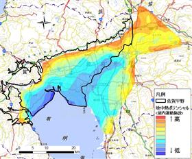 地中熱ポテンシャルマップ 最終更新日:2025年2月25日 佐賀県では、再生可能エネルギーの一つである地中熱の利用拡大に向けて、佐賀平野の地中熱ポテンシャルマップと唐津地域のポテンシャルマップを作成しました。 地中熱とは? 地下10mから200mの温度は年間を通じて安定しており、夏は外気温より低く、冬は外気温より高くなる特徴を利用して、夏は冷房に、冬は暖房に使用する技術です。 地中は空気よりも熱容量が大きいため、「エアコン」よりも効率的に室内の温度等を調整することができます。 地中熱の仕組み (SAGAサンライズパークを対象とした教育等コンテンツ事業) 地中熱ポテンシャルマップとは? 地中における熱交換の効率を「地中熱ポテンシャル」と呼んでいます。地中熱ポテンシャルは、地盤の構造や地下水の流れによって異なっており、地域ごとの地中熱ポテンシャルの違いを地図上に図示したものが地中熱ポテンシャルマップです。 佐賀平野の地中熱ポテンシャルマップ このポテンシャルマップは、以下の4つのタイプの施設について、一般的な冷暖房を地中熱で行うために必要となる地中熱利用施設の規模(熱交換器の本数、総延長)を面的に示しています。(熱交換器の本数、総延長等の詳細情報は、個別にお問合せください。)一般的な戸建て住宅医療福祉施設屋内運動施設(体育館)農業用ビニールハウス 全体的に、佐賀平野の北部が特にポテンシャルが高い傾向がみられます。また、現在公開されている他都県のポテンシャルマップと比較すると、佐賀平野のほぼ全域において、高い地中熱のポテンシャルがあることが分かりました。【一般的な戸建て住宅のポテンシャルマップ】【福祉施設のポテンシャルマップ】 【屋内運動施設(体育館)のポテンシャルマップ】【農業用ビニールハウスのポテンシャルマップ】 唐津地域の地中熱ポテンシャルマップ 唐津地域の平野部のポテンシャルマップ(図1)を作成しました。また、参考として平野周辺の地質図(図2)を載せております。 今回作成した、ポテンシャルマップは、佐賀平野のポテンシャルマップとはポテンシャルの指標が異なりますが、佐賀、唐津のどちらのマップも、地中熱のポテンシャル(利用可能性)を評価する上で有効な指標を表示しています。図1.唐津地域地中熱ポテンシャルマップ(深度100mまでの平均有効熱伝導率分布)図2.唐津地域の地質図と基盤岩の有効熱伝導率(実測データの中央値を表示) 唐津地域の地中熱ポテンシャルの特徴 唐津地域平野部の有効熱伝導率(深度100mまでの平均値)は1.75 W/(m・K)以上の値を示し、全体的に地中熱のポテンシャルが高い傾向にあります。また、周辺の山地・丘陵を構成する花崗岩類、堆積岩類、変成岩類も高い有効熱伝導率を示し、地中熱の活用が期待できます。※唐津地域は基盤岩が浅い深度から出現する事から、熱交換器を設置して地下と熱交換を行うクローズドループ方式がより適していると考えられます。※上場台地を構成する玄武岩に関しては、地下水位が深いことと有効熱伝導率のデータが十分に得られなかったことから、導入検討に際して地下水位と熱物性の調査を行うことが推奨されます。 地中熱ポテンシャルマップ利用マニュアル 地中熱ポテンシャルマップ利用マニュアル(佐賀平野) (PDF:1.48メガバイト) 地中熱ポテンシャルマップと地中熱の施設導入に関する相談窓口 佐賀県では、地中熱の普及を目指して、下記の研究会が発足されています。ポテンシャルマップの仕様方法や、地中熱利用施設の設置には、専門的な知識が必要となりますので、施設導入を検討される際には、下記の研究会へご相談されることをお勧めします。 外部リンク一般社団法人 有明未利用熱利用促進研究会〒849-0201佐賀県佐賀市久保田町大字徳万1856番地1電話:0952-68-3852