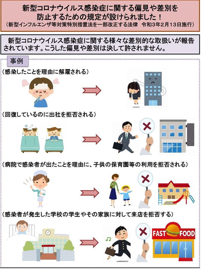 新型コロナウイルス感染症に関する偏見や差別を防止するための規定が設けられました! 最終更新日:2022年4月6日 「新型インフルエンザ等対策特別措置法等の一部を改正する法律」について(法務省)法務大臣からのメッセージ、新型コロナと人権に関する座談会等(外部リンク) (文部科学省)文部科学大臣からのメッセージ、新型コロナ“差別・偏見をなくそう”プロジェクト等(外部リンク)(厚生労働省)医療従事者、感染者等に対する差別・偏見をなくすための「広がれありがとうの輪」プロジェクト等(外部リンク) ※この他、民間団体等でも様々な取組が行われています。 (法務省) 人権相談窓口における相談受付http://www.moj.go.jp/JINKEN/index_soudan.html (厚生労働省)都道府県労働局における相談受付https://www.mhlw.go.jp/general/seido/chihou/kaiketu/soudan.html (文部科学省)児童生徒からのSNS等を活用した相談受付 https://www.mext.go.jp/a_menu/shotou/seitoshidou/1401926.htm (民間団体による相談受付) (法テラス)https://www.houterasu.or.jp/saigaikanren/houterasu-korona.html (日弁連)https://www.nichibenren.or.jp/news/year/2020/topic2.html (セーファーインターネット協会)https://www.saferinternet.or.jp/※この他、相談受付を行っている地方自治体等もあります。 (佐賀県)普及啓発 新型コロナウイルス感染症に関連する人権の配慮への対応について新型コロナウイルスと闘っている方々への応援メッセージ新型コロナウイルスと闘うすべての人へ「ありがとう」(外部リンク) (佐賀県)相談窓口 人権啓発センターさが 総合相談窓口 新型コロナウイルス感染症に関する正しい情報、知識を持ち、慈しみの心をもって行動しましょう。 詳しくは 新型インフルエンザ等対策特別措置法等の一部を改正する法律 (第13条2)(PDF:643.8キロバイト)参考 新型インフルエンザ等対策特別措置法等の一部を改正する法律 (全文)(外部リンク)