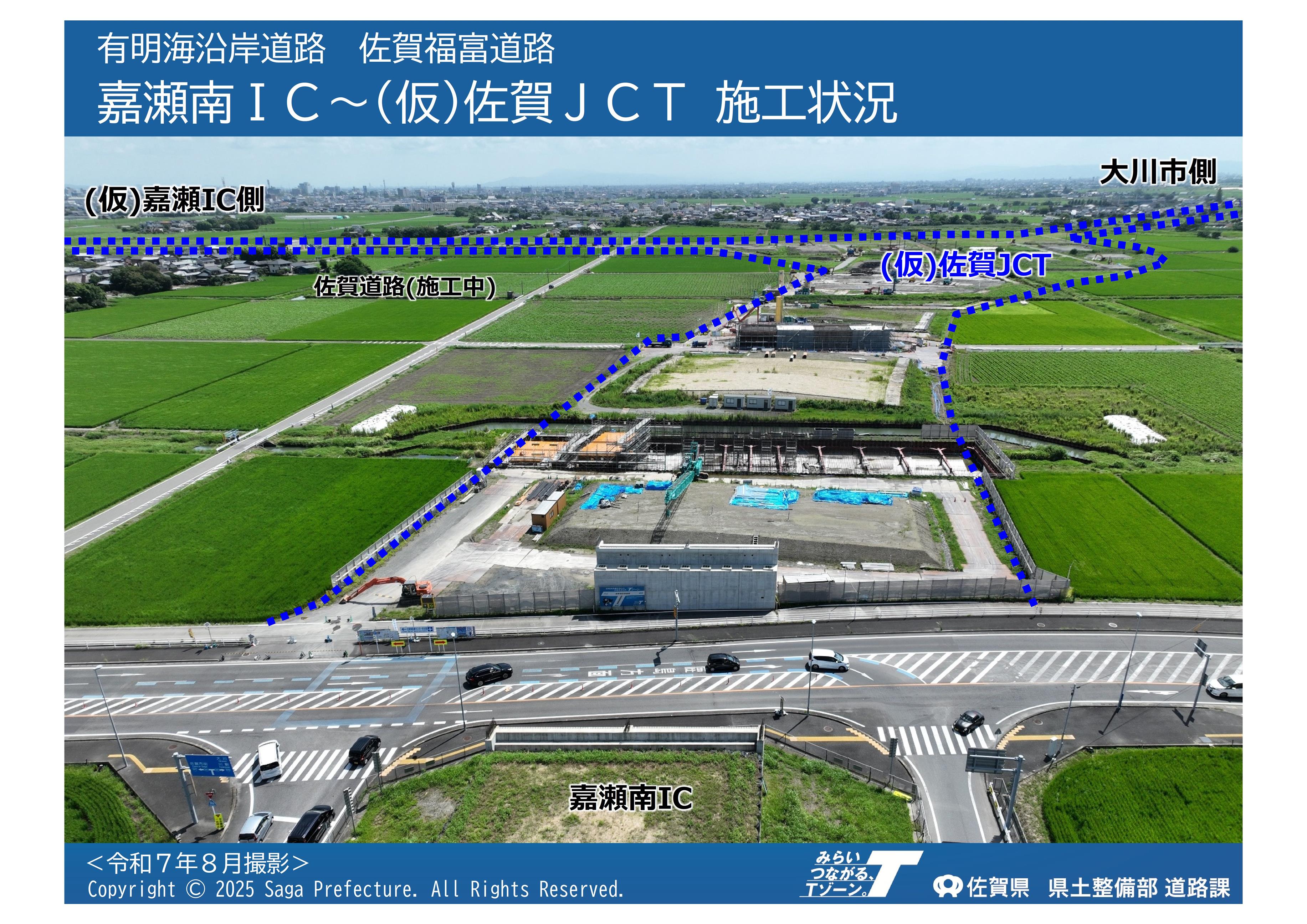 このうち佐賀県では、佐賀唐津道路と有明海沿岸道路が接続する(仮称)佐賀ジャンクションから白石町福富までの区間(L=約10.5km)を佐賀福富道路として、また、白石町福富から白石町深浦までの区間(L=約10km)を福富鹿島道路として整備を行っています。