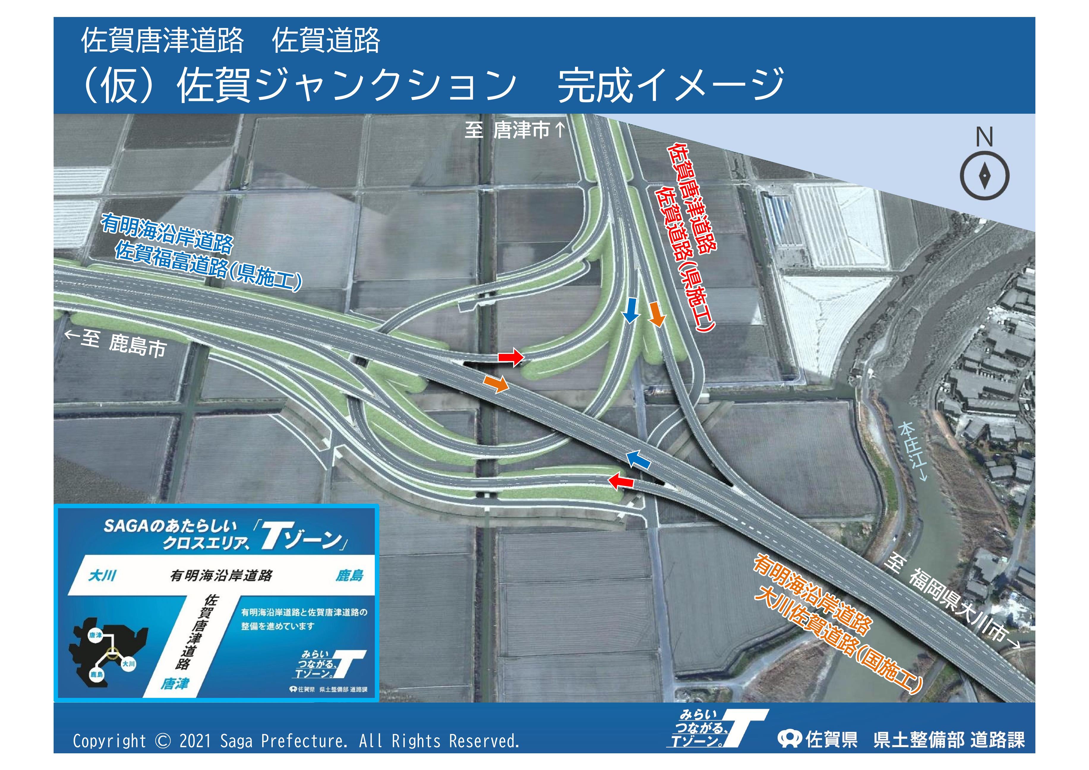 佐賀県では、九州佐賀国際空港や佐賀県医療センター好生館などとの広域的なアクセスを向上させ、県民の暮らしと地域の飛躍を支える基盤として、佐賀唐津道路と有明海沿岸道路が接続するエリア『Tゾーン』の整備に重点的に取り組んでいます。