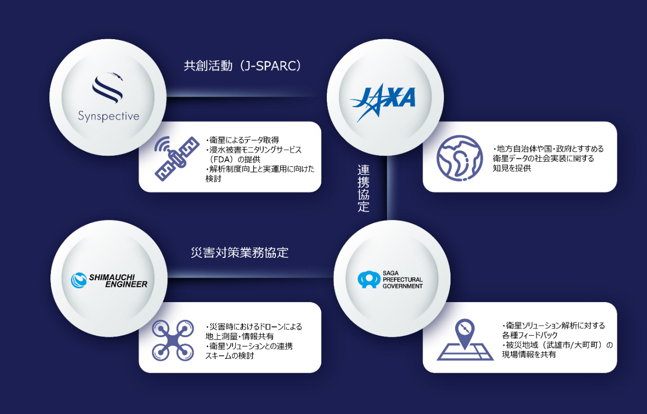 今回、株式会社Synspective(本社:東京都江東区、代表取締役CEO:新井元行、以下 Synspective)及び株式会社島内エンジニア(本社:佐賀県佐賀市、代表取締役:徳富泰信、以下 島内エンジニア)も参画し、衛星データ活用により、全国的に頻発している豪雨等への水災害への対策の強化に加え、Synspectiveの浸⽔被害モニタリングサービスの精度向上も目指し、平時・災害時での実運用に向けた実証実験を実施しました。