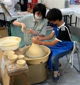 そのほか、エリア1会場では、本校セラミック科とデザイン科がパネル展示と体験ワークショップ(セラミック科のろくろ体験、デザイン科の缶バッジ制作)を行い、来場された皆様に楽しんでいただきました。